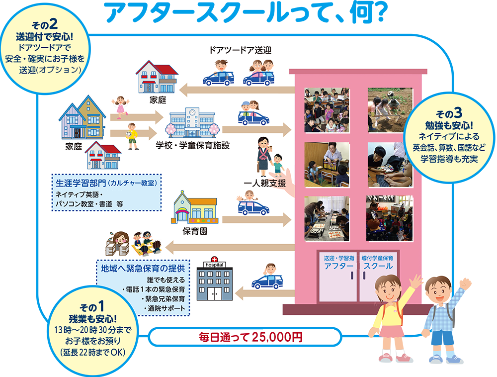 わたくしどもアフタースクールは、公設の学童では対応できない最長22 時までの延長保育、ドアツードアの送迎、手作りの食事、学習指導といった各種サービスを提供してまいりました。